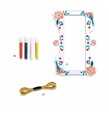 Contenido: 8 tubos de cuentas (8 colores), 1 telar, 2 carretes de hilo dorado y 1 folleto explicativo paso a paso.