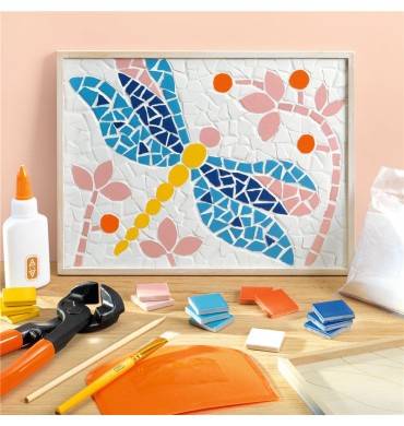 Contenido: 1 tabla de madera impresa con la ilustración de la libélula, 100 teselas de cerámica, 1 tenaza para cortar teselas, 1 bolsita de cemento, 1 espátula flexible, 1 tubo de cola, 1 modelo a seguir, 1 folleto y 1 tarjeta con código QR para acceder al tutorial en vídeo.