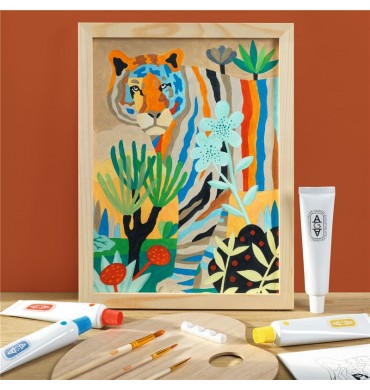 CONTENIDO: 1 lienzo (290 x 220 mm) con patrón marcado del tigre en la sabana, 4 pinturas acrílicas, 1 paleta de madera, 3 pinceles, 1 soporte para pinceles, 1 marco de madera, 1 modelo guía y 1 tarjeta con código QR que lleva un tutorial en vídeo.