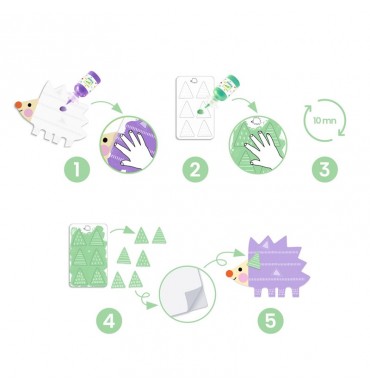 Se aplican unas gotas de pintura para colorear los animales con los dedos y, como por arte de magia, ¡aparecen unos pequeños motivos!. Por ultimo, el niño coloca los adhesivos para decorar.