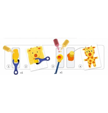 Una caja grande de pintura con temática de animales. Después de proteger la mesa con el mantel, el niño pinta todas las piezas utilizando el pincel, los rodillos y las esponjas. Una vez que las piezas están secas, decora las 4 tarjetas con imágenes grandes.