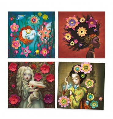 Para completar los 4 cuadros, el niño dispone de una gran variedad de corolas de flores de papel fáciles de ensamblar gracias a los encuadernadores de colores.