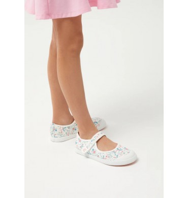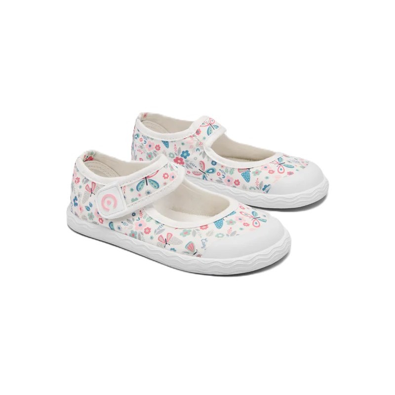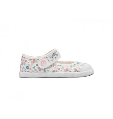 Merceditas Goflex Barefoot de lona multicolor con un cómodo estilo deportivo y un original estampado de flores y mariposas en suaves tonos azules y rosas sobre fondo blanco, perfectas para dar un toque diferente al look diario. Incorporan cierre de tira adherente para poner y quitar en segundos, con un ajuste cómodo y seguro.