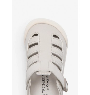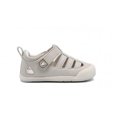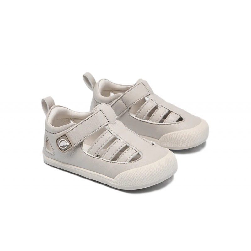 Sandalias barefoot beige cerradas, diseñadas para acompañar las aventuras diarias en los meses más cálidos. Su diseño combina la protección de la puntera cerrada con aberturas laterales que favorecen la transpiración, manteniendo el pie fresco y cómodo.
