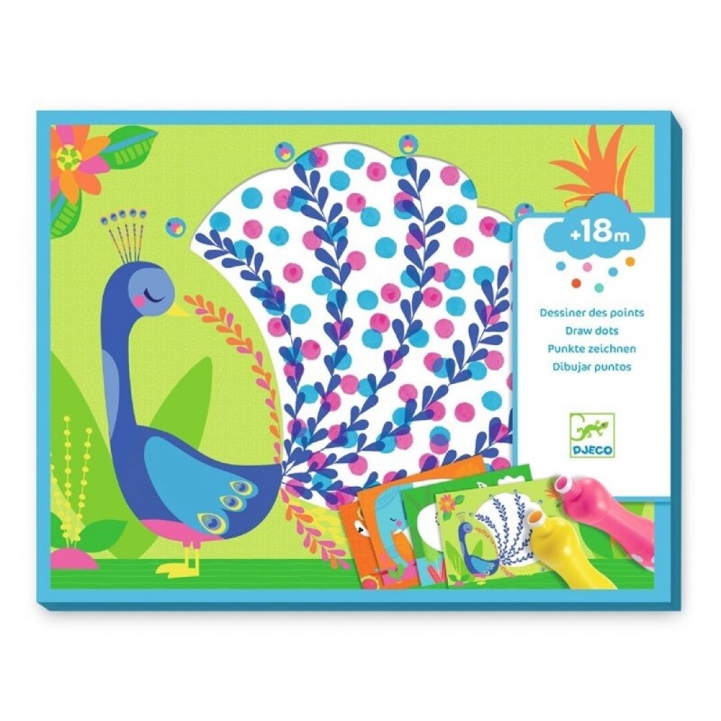 El niño colorea haciendo puntos con unos rotuladores de trazo grueso.