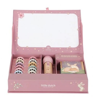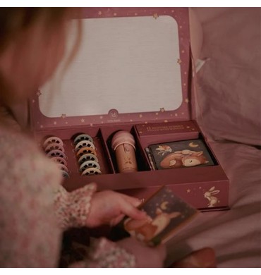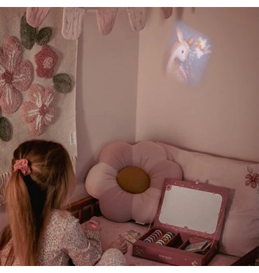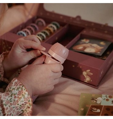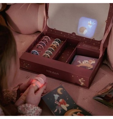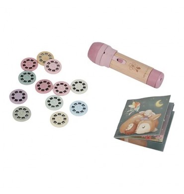 La linterna proyector tiene un resistente mango de madera y funciona con pilas, así que puedes llevarla a todas partes. Después de la historia, puedes guardar fácilmente la linterna y todos los accesorios en su bonita caja. Perfecta para niños que adoran descubrir y vivir historias.