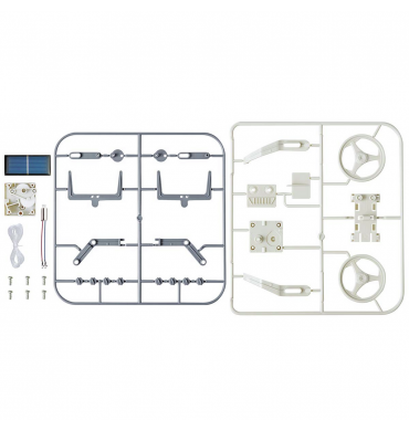 Incluye: 2 ganchos, 1 tapa de la caja de cambio, 1 placa de la cara, 1 placa de la base, 2 ruedas, 1 soporte para el panel solar, 2 enlaces para el brazo, 2 levas, 2 pies, 2 piernas, 8 conectores, 1 caja de cambios solar, 1 motor con cables, 1 panel solar, 1 sedal y tornillos.