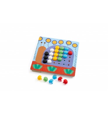 Un juego de mosaico apto para los más pequeños, a partir de 3 años, para crear cuadros completando los 8 dibujos de animales con chinchetas grandes.