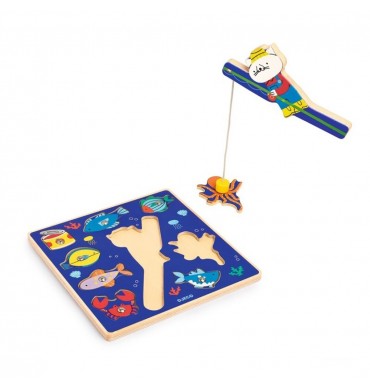 Precioso encajable y juego de pesca Djeco fabricado con madera recolectada de forma sostenible.