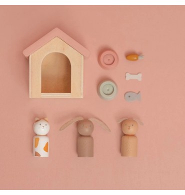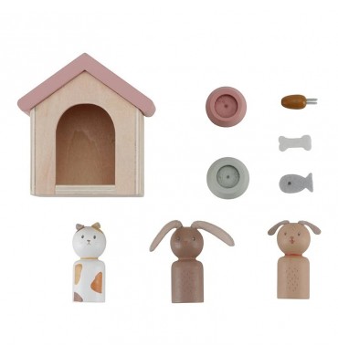 ¡Dale vida a la casita de muñecas Little Dutch con el set de mascotas! Dale la bienvenida a un perro cariñoso, un conejo adorable y un gato dulce a tu familia de muñecas. Ofréceles una cesta calentita, comederos y juguetes para que se diviertan. Vive aventuras inolvidables y momentos de mimos con estas encantadoras mascotas y sus accesorios a juego. ¡La casita de muñecas se convierte en un auténtico zoológico!