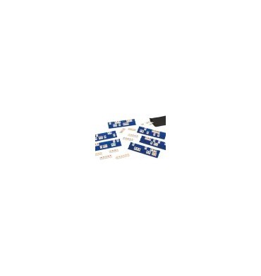 Sencillo y apasionante juego en el que cada jugador debe tratar de combinar sus fichas, haciendo agrupaciones de un mismo número en distinto color o escaleras del mismo color y conseguir quedarse sin fichas. Versión hasta 6 jugadores. Tamaño ficha: 1,8×2,5×0,4 cm.
