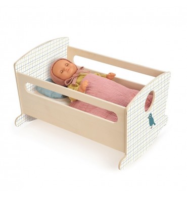 Una mecedora de madera natural y colores suaves con un colchón, una almohada y una suave manta. Ultracómoda para que la muñeca se duerma plácidamente mecida por sus pequeños padres.