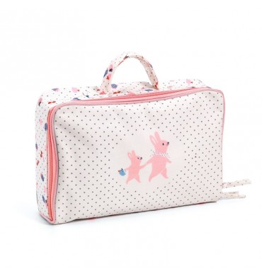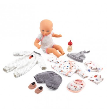 Contenido: Muñeca, maleta, pijama, gorro, un pañal, un biberón, un babero, camiseta cruzada con botón delantero, un pantalón y zapatillas.