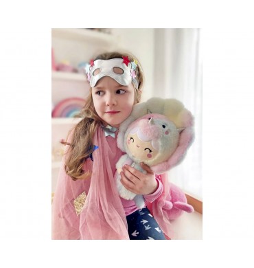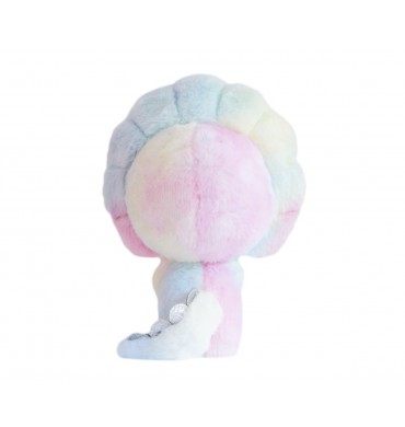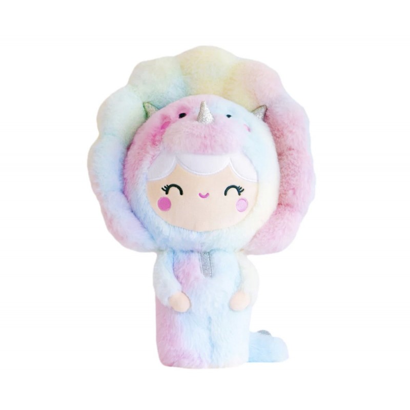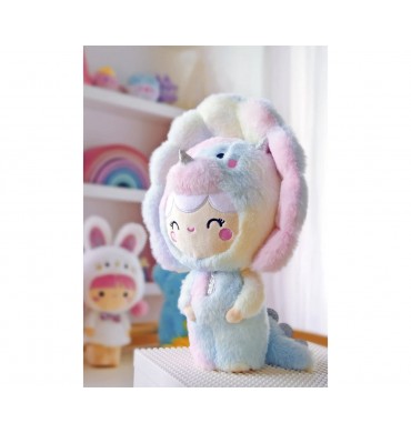 Suave peluche Momiji, con detalles bordados y disfraz de dinosaurio en tonos pastel.