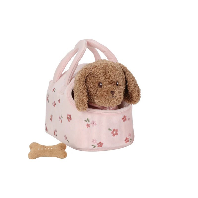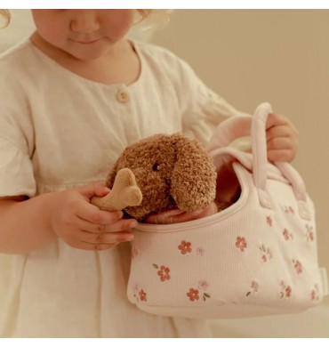 ¡Lleva a tu fiel amigo de cuatro patas a todas partes con este adorable perrito de peluche, Jackie, en una bolsa de transporte con estampado floral! Con su suave tejido y su dulce carita, se convertirá rápidamente en el peluche favorito de tu pequeño. La bolsa tiene una práctica abertura frontal para que la cabeza del perrito pueda asomar con curiosidad. El conjunto también incluye un hueso de peluche para jugar. ¡Un sueño para cualquier pequeño amante de los animales!