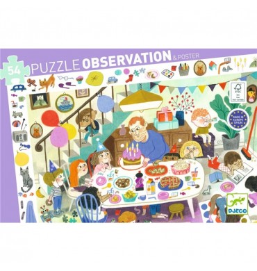 Puzzle de observación Fiesta de cumpleaños Djeco de 54 piezas. Una vez que lo termines encuentra los objetos que aparecen en los bordes.