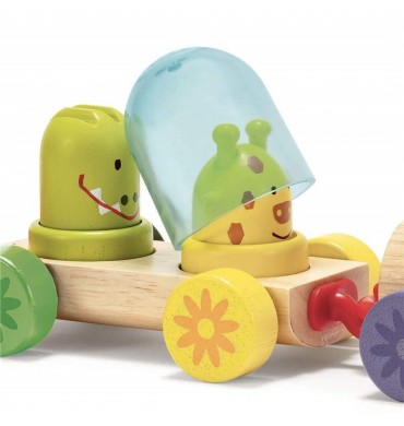 -Un colorido tren de madera que el niño arma usando su imaginación y 3 campanas translúcidas coloreadas que le harán descubrir las mezclas de colores. Una vez que el tren está armado, el niño puede pasearlo con ayuda de un cordón.
